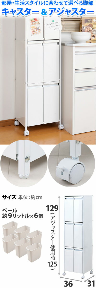 ■商品仕様[材質]本体:スチール(エポキシ樹脂粉体塗装)、ペール:ポリプロピレン完成品(キャスター・アジャスターのみ組み立て)商品重量19kg9リットルペール×6個梱包重量21kg梱包サイズ約:幅39×奥行36×高さ127cm日本製■商品サイズサイズ:約幅36(ビス含む)×奥行31×高さ129(アジャスター使用時125)cm■注意事項組み立て完成品(キャスターのみ取付)備考商品画像は色合いや素材感が実際の商品と異なる場合がございます。